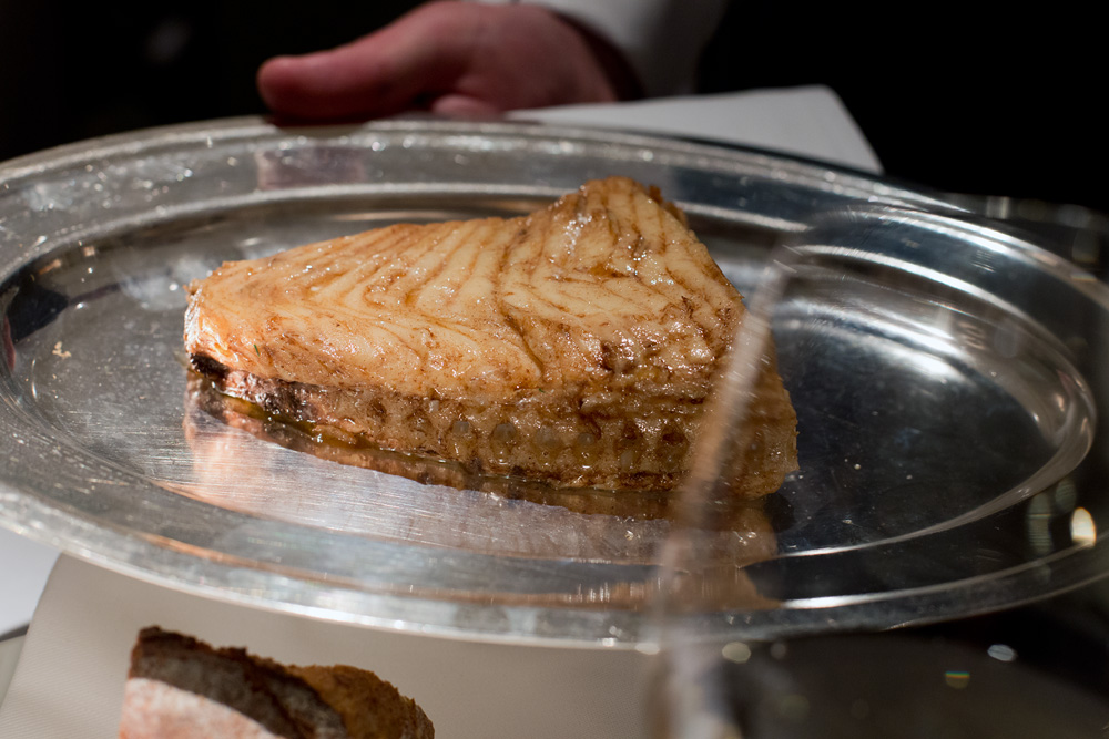 Stolze 8 Kilogramm schwer war der Zander als er heute Morgen aus dem Tessin angeliefert wurde – ein Wildfang aus dem Lago Maggiore. Sven brät den Fisch mit Butter in der schönen Messing-Bratpfanne. Der Zander ist saftig und hat ein sehr schönes Eigenaroma. Dazu serviert man uns eine etwas andere Beurre Blanc bei der man auf fermentierte Topinambur zurückgreift. Dieser ist sehr markant und sorgt für ein grandioses Geschmacksbild. Schön auch das Zitronenaroma, obwohl es etwas dezenter eingesetzt, mehr zur Eleganz dieses Gerichts beisteuern würde.