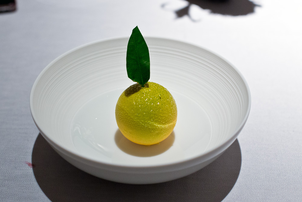 Die Königstaube bringt das Menü sofort wieder aufs ganz hohe Niveau. Die Taubenbrust aus der Bresse schmeckt grossartig und ist perfekt gegart. Das Gericht läuft in Kombination mit dem Knollensellerie, den eingelegten Pilzen und der Nusspaste zur Höchstform auf. Das essbare Laub wird aus Selleriesaft und fermentiertem Steinpilzsaft hergestellt. Ein grossartiger Abschluss der salzigen Gerichte.