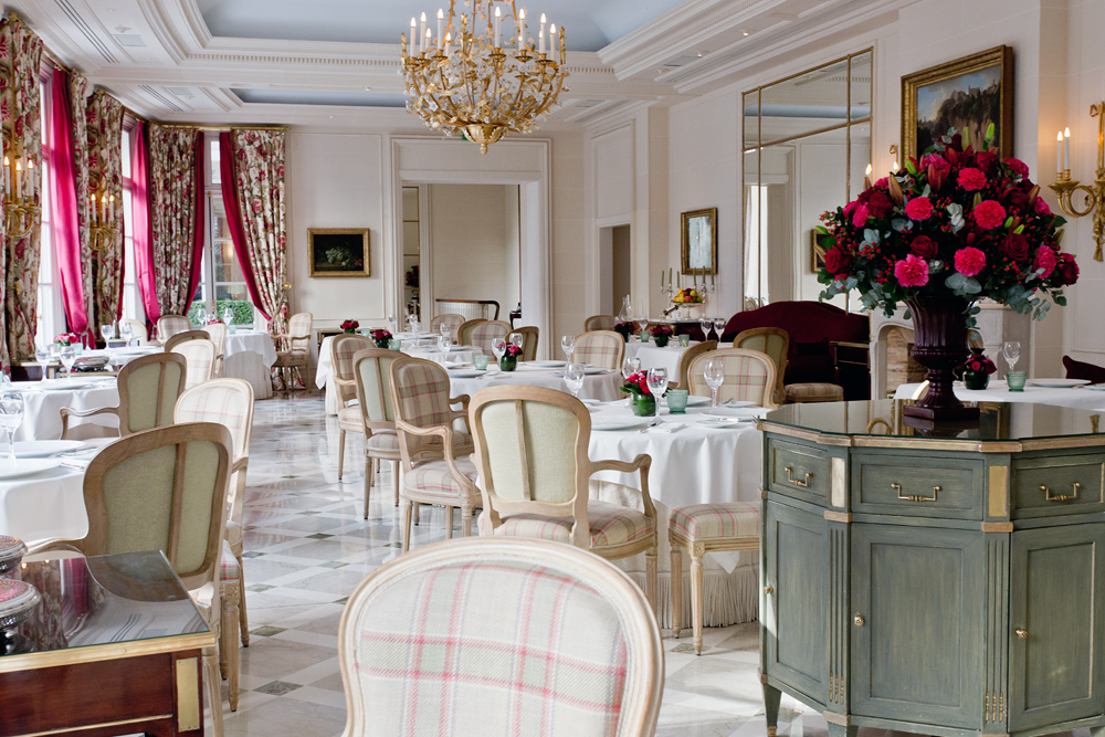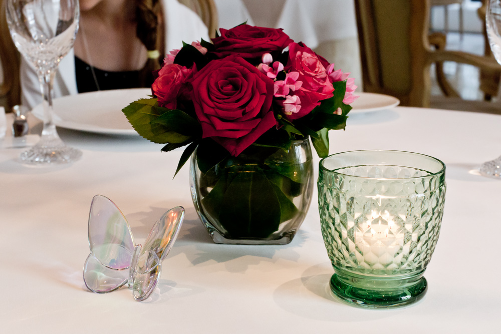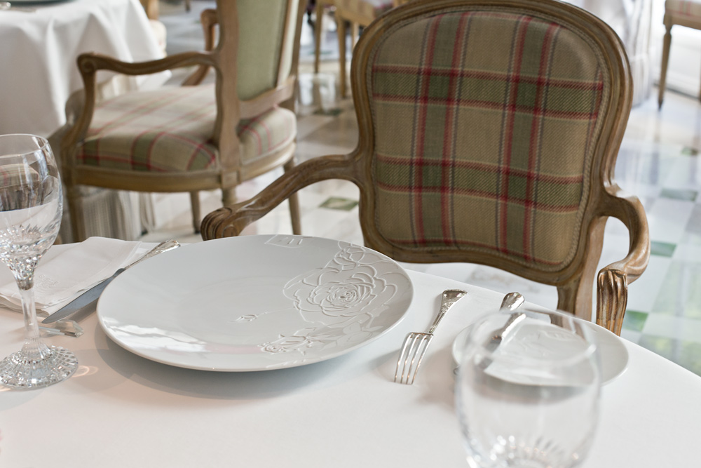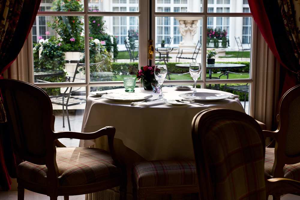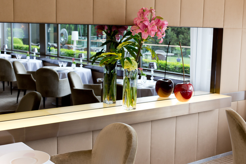 Pünktlich um 19 Uhr öffnet sich die verspiegelte Tür. Die Empfangsdame dahinter begrüsst uns mit einem freundlichen „Bonsoir“, prüft unsere Reservation und begleitet uns an den Vierertisch in der Restaurantmitte. Alle 16 Tische im lichtdurchfluteten Raum sind elegant gedeckt. Das Interieur ist hell, freundlich und einladend. Erst vor wenigen Jahren wurde das Epicure von Pierre-Yves Rochon neu gestaltet. Bis zum Umbau trug das Restaurant den gleichen Namen wie das Hotel und das Setting war dunkel und streng. Kein Vergleich zum jetzigen Ambiente. Schön ist auch der Blick direkt in den Hotelgarten. An warmen Sommertagen werden die grossen Fensterflügel geöffnet, damit die warme Brise das Restaurant durchflutet.
