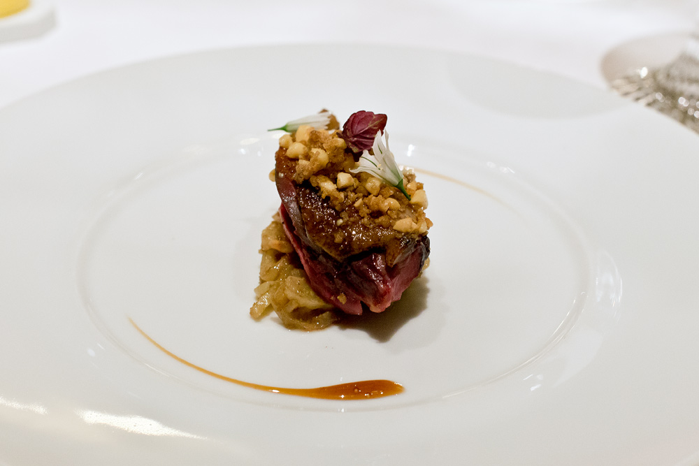 Im Hauptgang serviert man uns eine Taube aus der Bresse, welche wie vom Chef empfohlen, medium-rare zubereitet ist. Wir probieren zuerst von der Sauce, die uns wiederum völlig in ihren Bann zieht. Das braune Elexier ist extrem vielschichtig und schon für sich alleine ein Highlight. Auch der wundervolle Vogel begeistern. Dieser ist perfekt gebraten und hat eine wunderbar knusprige Textur von Pinienkernen und einer angenehmen Süsse vom Honig, welche wiederum meisterhaft subtil ins Gericht eingeflochten ist. Für den würzigen Kontrast sorgt der Fenchel mit Kreuzkümmel.