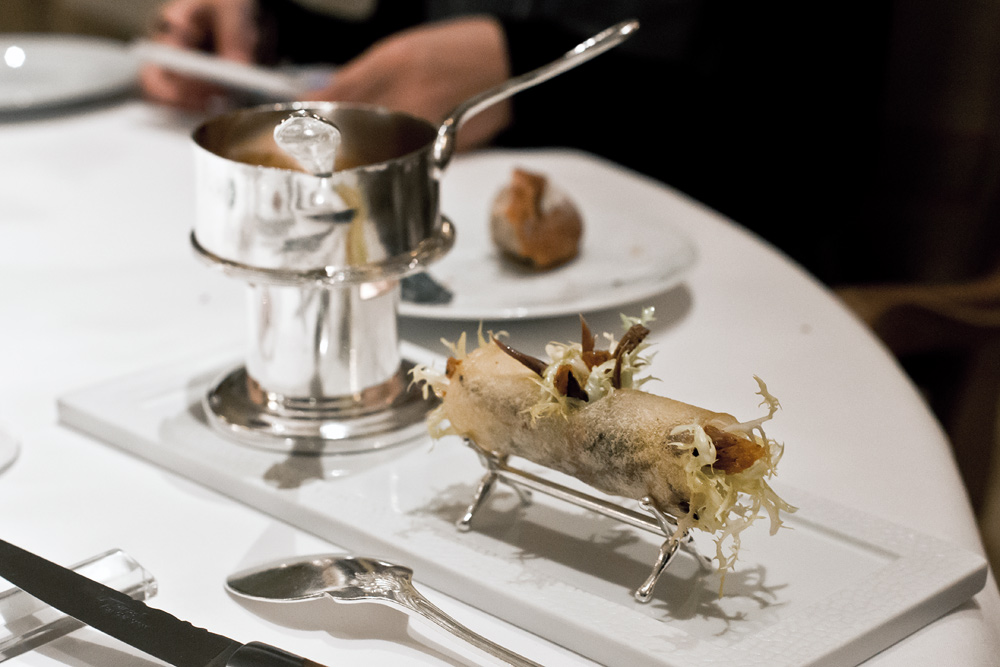 Das 3-Sterne-Restaurant bietet allerhöchsten Komfort. Der Service ist von Beginn weg sehr präsent. Dabei werden wir überrascht, wie professionell aber dennoch locker und pointiert humorvoll, mit den Gästen umgegangen wird. Das erste Klischee vom verstaubten, steifen Restaurant können wir schon mal überzeugt von der imaginären „Pariser-Vorurteil-Liste“ streichen. Jetzt kommt einer der vielen Sommeliers an unseren Tisch und erkundigt sich nach unseren Apéro Wünschen. Unsere Wahl fällt auf ein Glas Rosé Champagner aus dem Hause Bollinger – eine hervorragende Wahl.