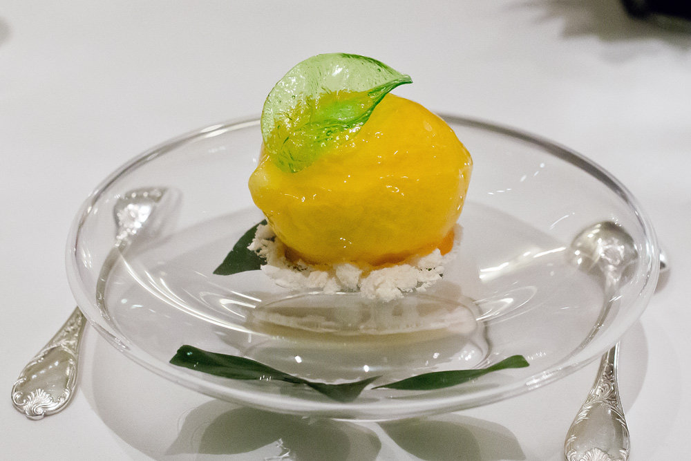 Die französische Stadt Menton liegt zwischen Monaco und Italien und ist berühmt für ihre Zitronen. Jeannin zaubert daraus ein fulminantes Dessert, in der Form einer solchen Zitrusfrucht. Anders als der Anblick vermuten lässt, ist die Hülle nicht aus hartem Zucker, sondern hat dieselbe Konsistenz wie das Sorbet im Innern und ist dadurch perfekt zu essen. Das Sorbet ist schlicht fantastisch. Die enthaltenen kandierten Zitronenstücke setzen dem Ganzen die Krone auf. Ein konzeptionell simples Dessert, welches traumhaft intensiv schmeckt und wunderbar leicht ist.