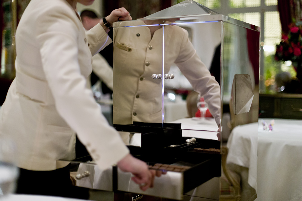 Die Friandises werden in einem futuristischen Wagen präsentiert. Dieser erinnert eher an ein avantgardistisches spanisches Restaurant, als ein klassisch französisches. Dass wir in Paris im Epicure sitzen, offenbart sich alsbald wir die erste Süssigkeit probieren. Es sind Marshmallows. Normalerweise gibt es nichts Weiteres dazu zu sagen, denn wirklich gut schmecken die nie. Hier zaubert uns die Pâtisserie-Equipe, dank einem richtig guten Birnenaroma, aber nochmals ein Lächeln auf die Lippen. Getoppt wird das von den besten uns jemals servierten Caramels, sowie tollem Nougat. Das Highlight sind aber die Macarons. Wir lieben die bunten Winzlinge seit Jahren und haben deshalb schon etliche Varianten probiert. Aber so gute, so frische, so geschmacksvolle wie hier, haben wir bis anhin noch nie gegessen. Unvergesslich!