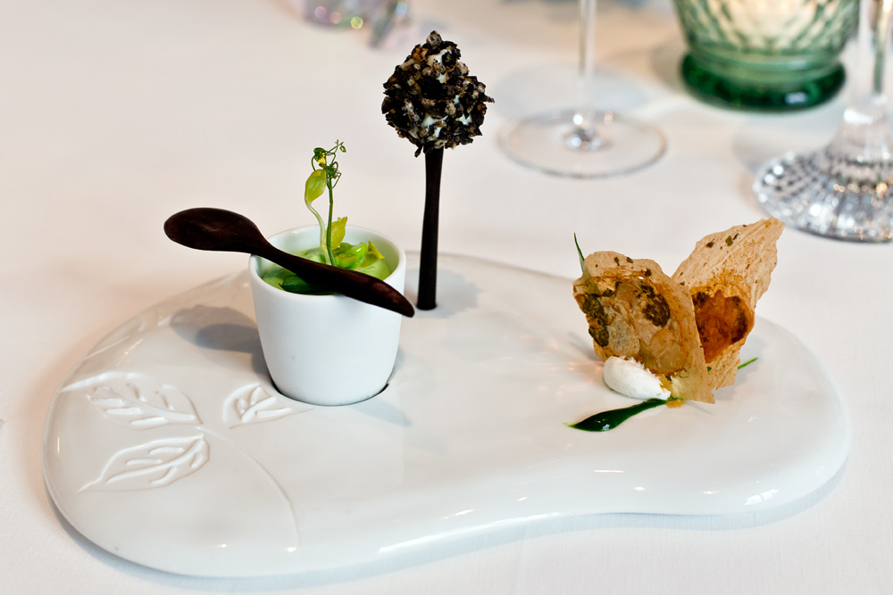 Nun werden die ersten Häppchen geschickt. Das, mit Erbsen grün gefärbte Mousse von der weissen Spargel, zeigt schon mal eindrücklich, auf was wir uns heute Abend freuen dürfen. Das Aroma ist kräftig, die Geschmäcker sind klar herausgearbeitet. Wir versinken förmlich in dem kleinen Porzellan.