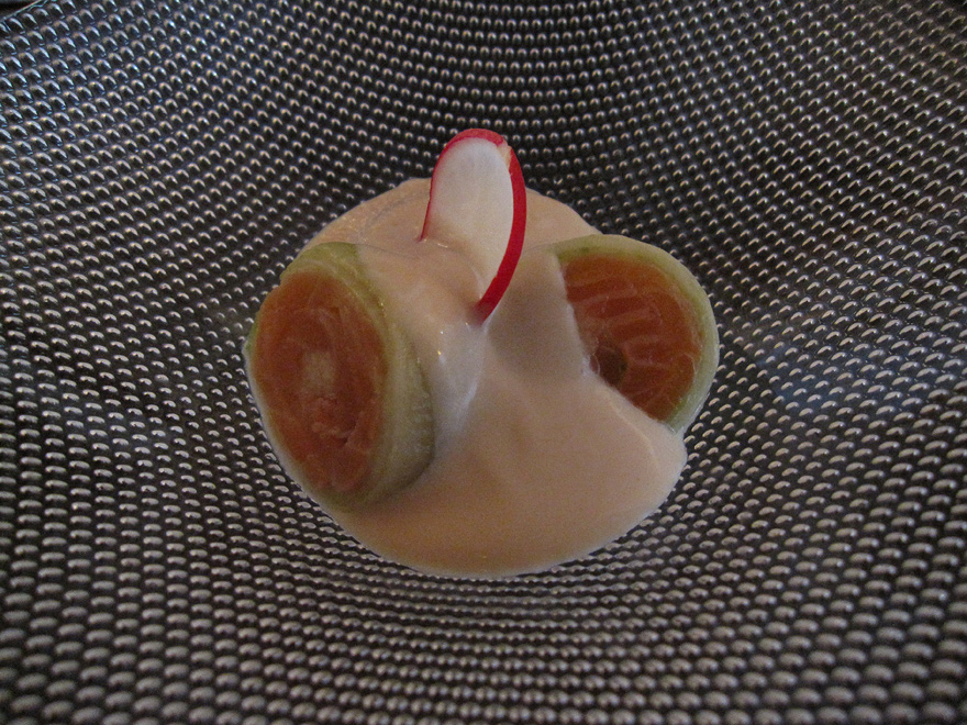 Ein sommerlich anmutendes Gericht mit süffig feinen Aromen wird als zweites Amuse serviert. Uns fehlt hier ein mutiger Akteur, weshalb wir das Gericht nach dem Verzehr gleich wieder vergessen.