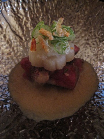 Sauerrahmmousse mit Pumpernickel und Mohngrissini / Jakobsmuschel mit Soja und Rübli / Crevette mit Cognac und Meerrettich [-/10]
