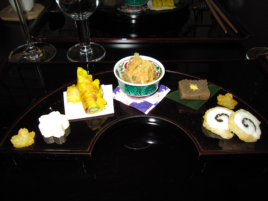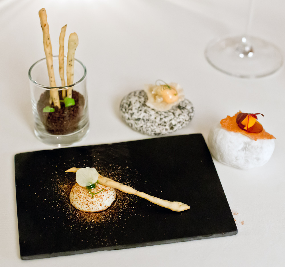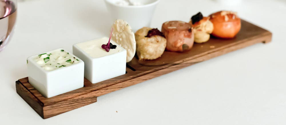 Wir starten mit ein paar filigran angerichteten Knabbereien. Sie sind geschmacklich sehr zugänglich. Lediglich bei der Geschmacksbalance sind Schwächen auszumachen. So dominiert fast immer ein Aroma etwas zu stark, weshalb das anvisierte Geschacksbild etwas verfehlt wird.
