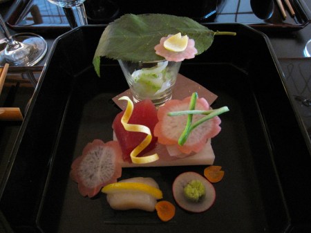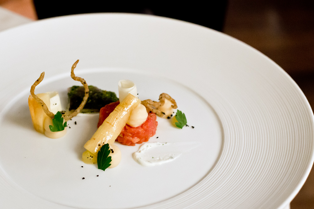 Amuse Bouche: Gebeizter und grillierter Thunfisch mit Babyrande, Himbeeressig, Brunnenkresse und Rettich