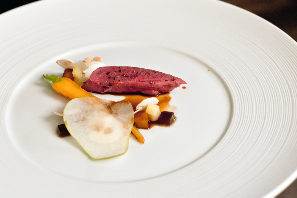 Eine wunderbare sous-vide gegarte Taube leitet die Fleischgänge ein. Der schön zubereitete Vogel wird mit vielerlei knusprigen Elementen und einem schönen Jus begleitet. Letzterer hätte man ruhig noch etwas mutiger einsetzen dürfen.