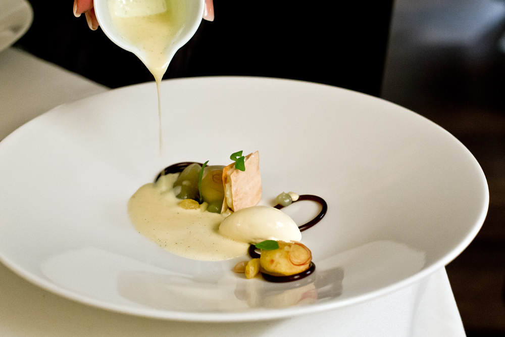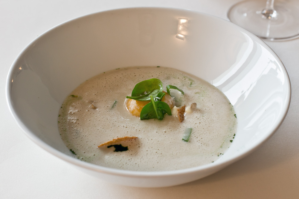 Das nächste Gericht ist wunderbar süffig. Im Zentrum stehen knusprig frittierte Poulet-Bällchen mit Sot-l’y-laisse, daneben frischer Trüffel sowie Mousse und Püree von Schinken, Trüffel und Salat. Abgerundet wird die tolle Komposition von einem wunderbaren Jus. Ein Gericht zum reinknien und immer wieder essen.