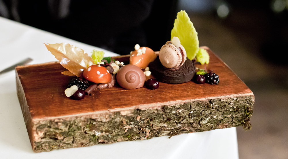 Das zweite Dessert gehört zu den schönsten, uns jemals aufgetischten Süssspeisen. Aber nicht nur die Präsentation ist wunderschön, auch die Aromen und Texturen überzeugen und machen diesen herbstlichen Spaziergang ganz besonders. Es schmeckt nach Beeren, Haselnuss Schokolade und Hagenbutte. Einzig der überproportionierte Schokoladen-Taler raubt dem süssen Abschluss etwas von seiner Eleganz. In Summe ein sehr spannendes und fruchtiges Dessert.