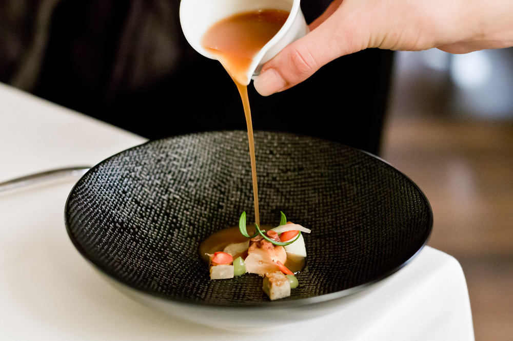Der Abschluss der Amuse-Trilogie wird auf einem schwarzen Teller serviert. Der Pulpo ist zwar etwas stark abgekühlt, aber wunderbar zart. Das Zusammenspiel mit dem säurehaltigen Granny Smith funktioniert sehr gut. Auch der Fisch-Fond überzeugt – auch wenn wir den typischen Safran-Geschmack der klassischen Bouillabaisse etwas vermissen.
