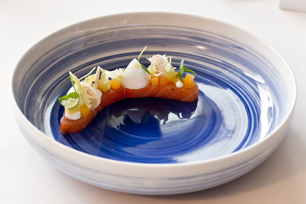 Wir nehmen Platz und ordern das Mittagsmenü in 4 Gängen zu fairen 62 Franken. Die Veränderungen gegenüber dem letzten Besuch, machen sich auch auf den Tellern bemerkbar. Bereits die Häppchen kommen frischer und geschmacksvoller daher. Die Präsentation ist sehr stimmungsvoll. Anschliessend serviert man uns ein etwas gar süsses, aber spannendes Amuse Bouche mit Thunfisch, Rande und Himbeere. Der erste Gang des Menüs, ein wunderbarer Lachs, setzt dann ein erstes grosses Ausrufezeichen. Das Gericht ist sehr präzise zubereitet und stark auf den Geschmack fokussiert. Stark ist auch die Sonnenblumenkernsuppe mit seinem wunderbar rauchigen Aroma – eine sehr harmonische Komposition.