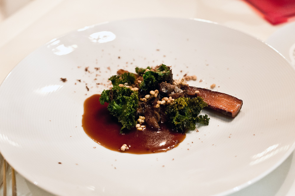 „Gemüsegärten“ sind momentan on vogue. Auch im Pavillon steht er auf dem Menü. Eperon verwendet dafür drei verschiedene Gemüsesorten die er dünn aufschneidet. Wir finden verschiedene Randen-Sorten, Pastinake und Navetten auf dem Teller. Dazu kombiniert er eine Zitronen-Vanille-Vinaigrette die man uns am Tisch elegant darüber träufelt. Dadurch entsteht ein angenehmes, süss-saures Zusammenspiel. Dieser Geschmack hat dann aber auch die Oberhand, wodurch man die einzelnen Gemüsesorten fast nur durch die Konsistenz voneinander unterscheiden kann. So ist das Gericht leider bereits ab der Hälfte äusserst repetitiv und eintönig.