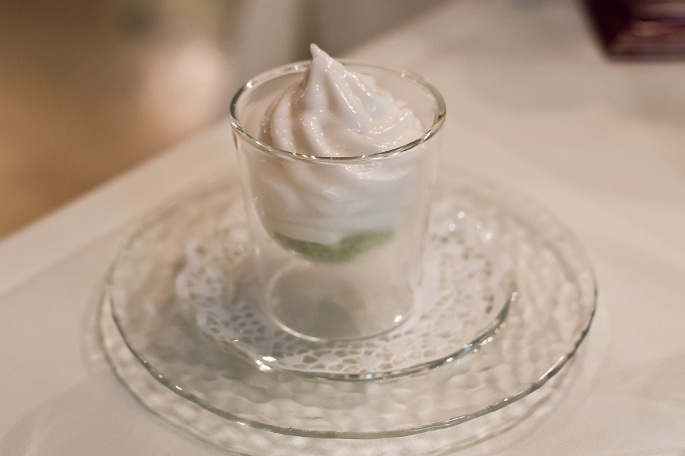 À part serviert man uns in einem zweiten Schälchen eine Baguette-Glacé auf Pumpernickel-Honig-Biskuit und Milchschaum. In der Tasse finden wir einen warmen, sehr feinen Thymian-Grapefruit-Honig Tee.