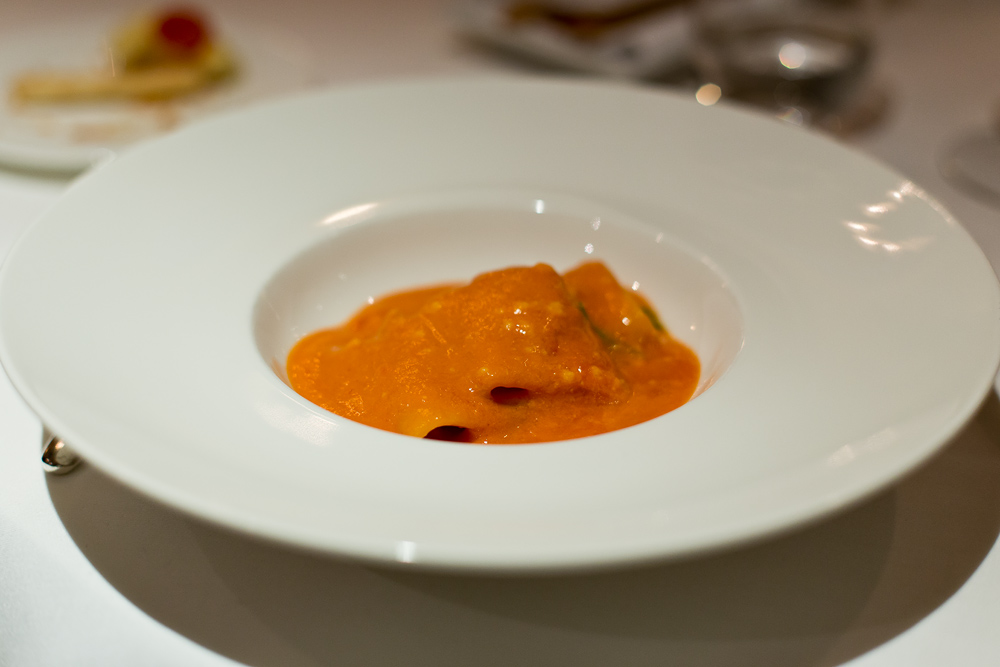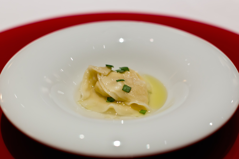 Der Raviolo duftet nach feinem Basilikum. Am Gaumen erinnert er uns an die Convinience Version aus der Migros. Mit dem Unterschied, dass dieser hier weitaus wässriger schmeckt, als die ebenfalls eher ausdruckslose Variante vom Detailhändler.