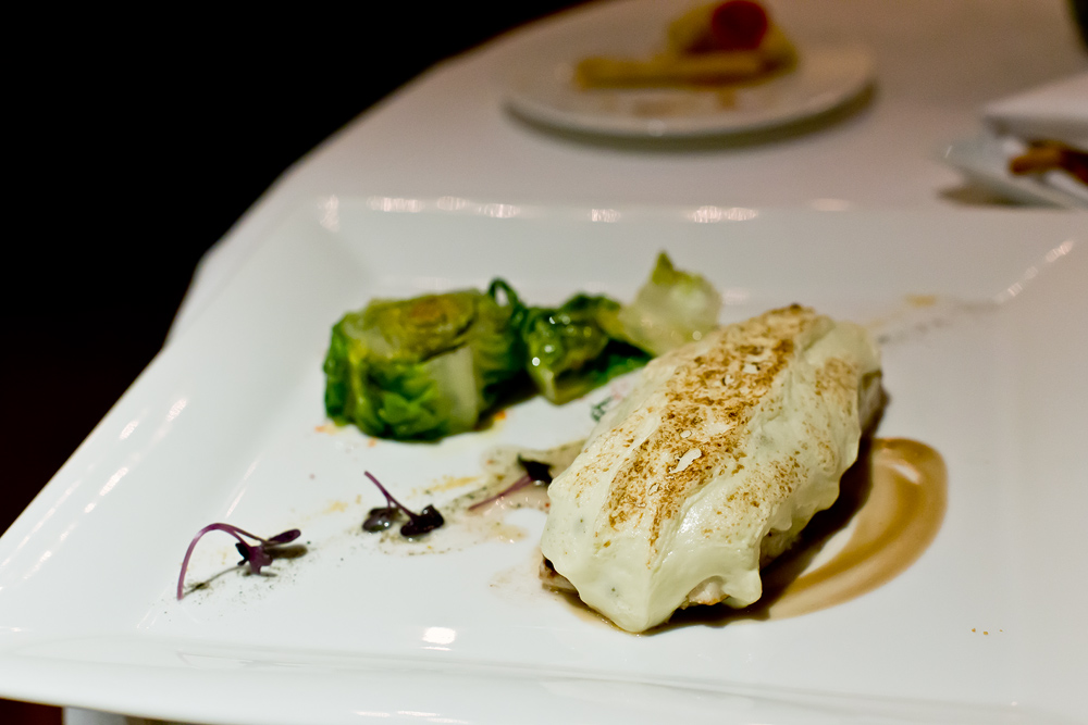 Zeit für einen signature Dish von Martin. Das Gericht steht seit 2008 auf seiner Karte. Wir tauchen den Löffel in die Schale und führen das Müsli an den Gaumen. Dort schmilzen die Leberperlen langsam und setzen ein sehr feines Aroma frei. Sofort wird es von den Säurenoten der getrockneten Himbeere und Passionsfrucht flankiert. Ein sehr gutes und harmonisches Gericht, bei dem wir uns lediglich ein etwas intensiveres Leber-Aroma wünschten. Zudem vermissen wir die vom Gault-Millau erwähnte „Explosion am Gaumen“. Die kleinen Leber-Stückchen schmelzen zu langsam um eine solche Wirkung zu erzeugen. Trotzdem, bis jetzt klar das beste Gericht – so darf es weitergehen!