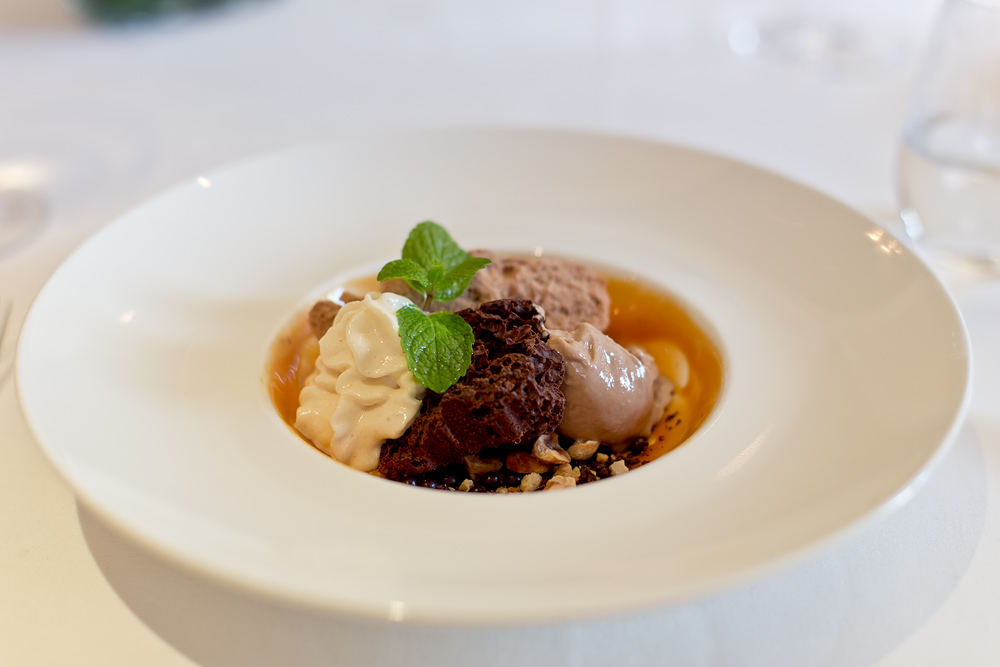 Die Küche von Denis Martin polarisiert. Wir gehören zu der Art von Gästen, die eine gute Praliné, serviert auf einer simplen Papierserviette, jederzeit einem trockenen Bisquit, welches aus einem imposanten Ballon fällt, vorziehen. Wir mögen zwar überraschende Effekte, aber nur dann, wenn sie auch einen kulinarischen Nutzen haben. An diesem Abend hinkten aber die meisten Speisen geschmacklich weit hinter der Visualisierung her und oft hatten wir das Gefühl, dass der Goût, bei der Rezeptur, nur eine kleine Nebenrolle spielt.