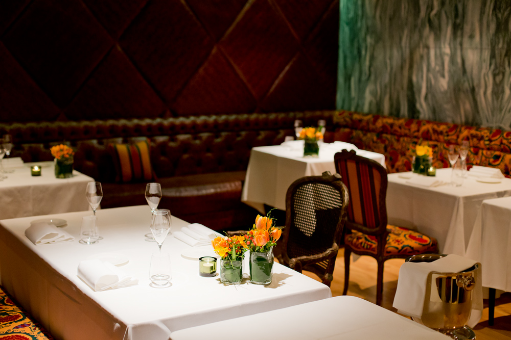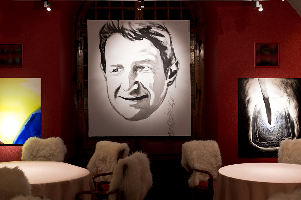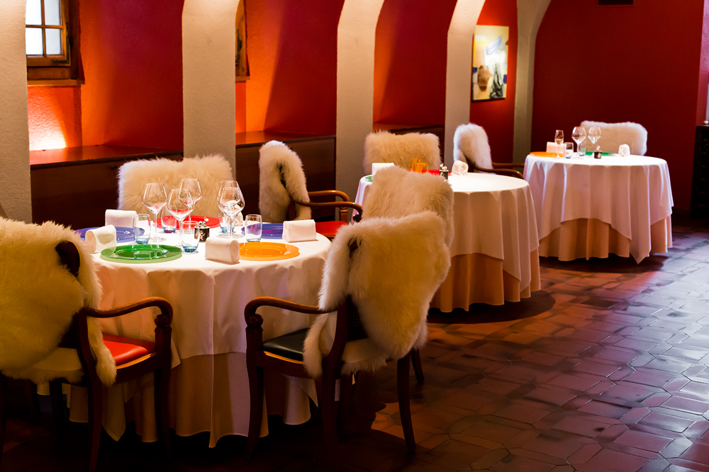 Ein paar Minuten verspätet, haben wir es dann doch geschafft. Wir betreten das von aussen eher bieder wirkende Restaurant und treffen innen auf ein dunkles, rot gestrichenes Kellergewölbe. Die 16 Tische sind auf zwei Speiseräume verteilt. Auf jedem Stuhl wartet ein flauschiges Lammfell, auf den Tischen stehen bunte Setzteller und in jeder Tischmitte eine Muh-Dose – wir sollen gleich erfahren weshalb. Eine grosse, elegant gekleidete Servicebrigade serviert den Gästen um uns herum den Apéro.