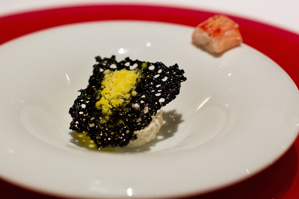 Auffallend, zum ersten Mal am heutigen Abend verbreitet sich im Restaurant ein angenehmer Duft nach gutem Essen. Ein toller Kaisergranat an leicht geröstetem Sesam wird serviert. Eigentlich ein wunderbares Gericht, wäre da nicht dieses befremdliche Rotweinpulver, welches überhaupt nicht zum Krustentier passen will und ihm damit die Chance raubt das Highllight des Abends zu werden.