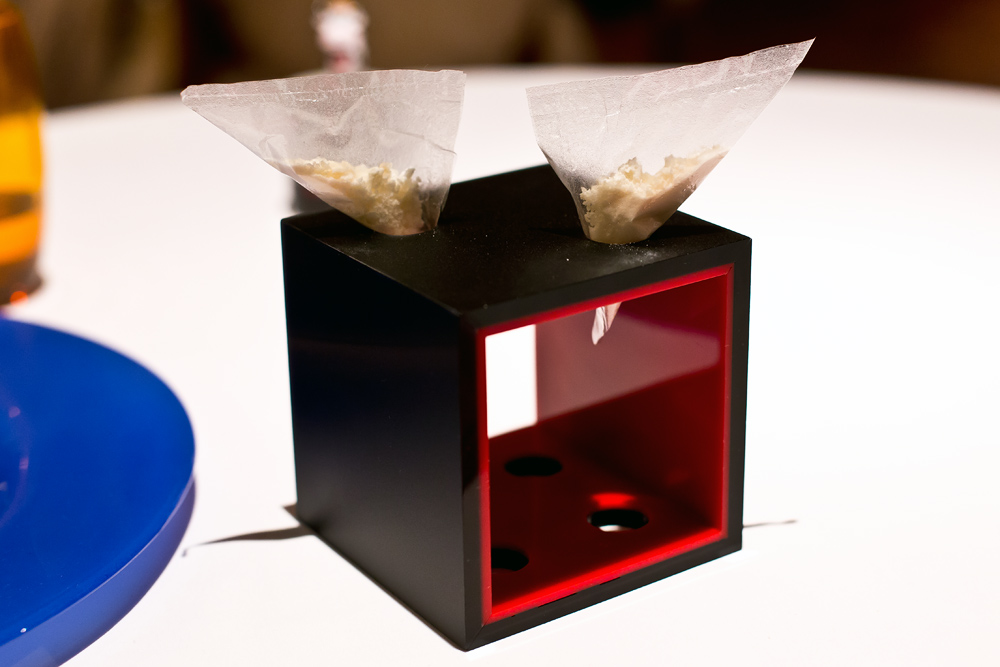 Am Tisch angekommen erhalten wir die Weinkarte. Die Auswahl ist knapp und mehrheitlich auf Flaschen ab einem dreistelligen Betrag limitiert. Eine Speisekarte ist obsolet, denn hier wird ausschliesslich das 26 Gänge umfassende Menü serviert. Auf Allergien und Unverträglichkeiten wird eingegangen. Wir sind bei der Weinauswahl, mit Blick auf das abwechslungsreiche Menü, überfordert und wünschen uns eine passende Weinbegleitung. Eine solche bietet man überraschenderweise nicht an, weshalb wir uns für ein Glas vom einzigen Weisswein im Offenausschank entscheiden.