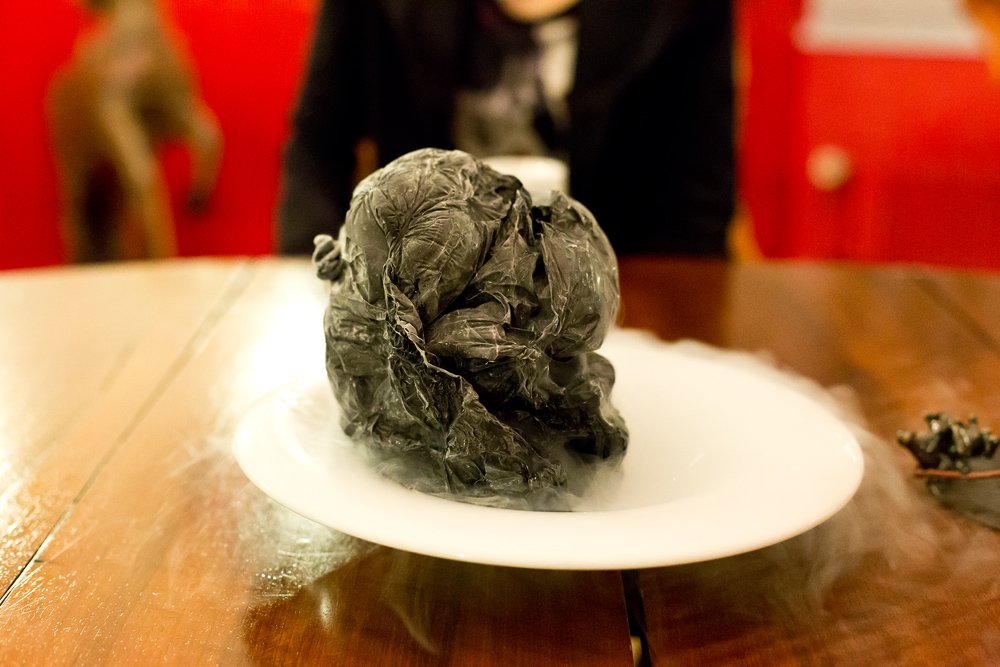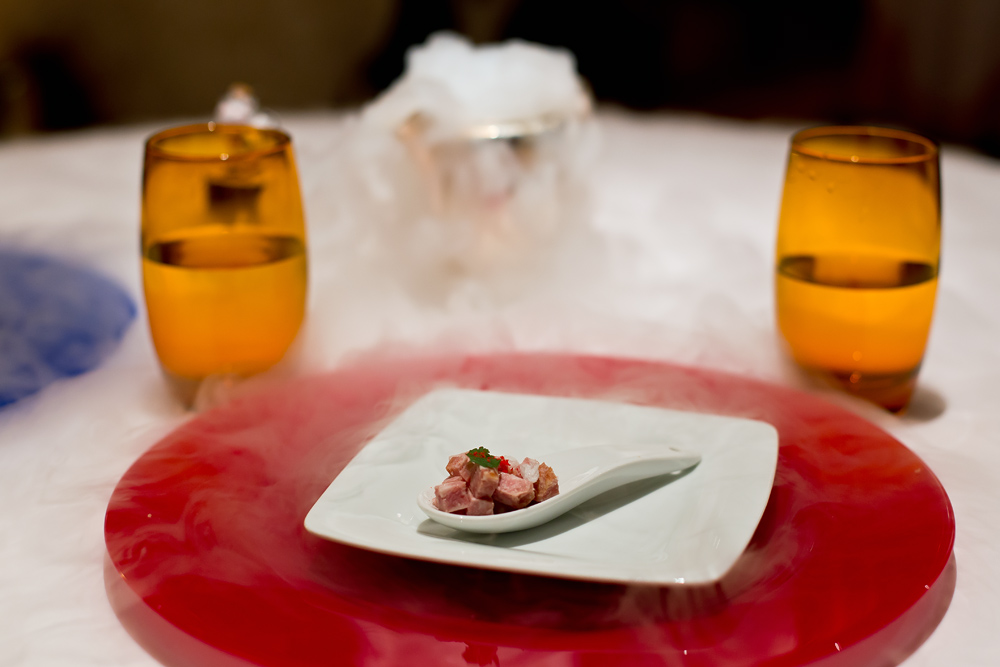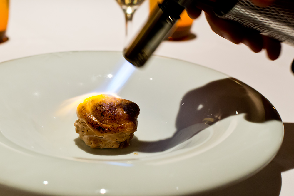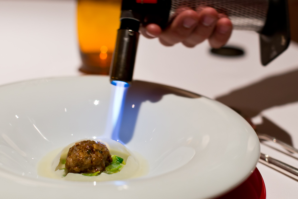 Zeit für den letzten Gang vor den Desserts – Auftritt für den Bunsenbrenner. Gekonnt wird die dünne Kuppel über dem Gericht zu einer Sauce geschmolzen und das darunterliegende Schweinefleischbällchen freigesetzt. Das an eine Dim-Sum Füllung erinnernde Fleisch gefällt uns sehr, weniger die wässrige Sauce und der verkochte Lauch.