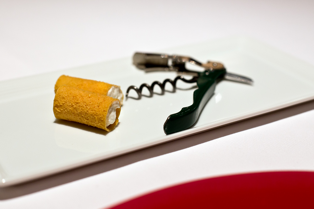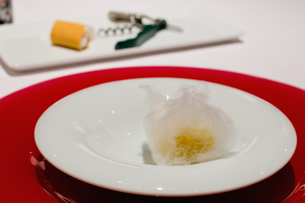 Auch das nächste Gericht ist eines der Highlights des heutigen Abends. Der in Zuckerwatte gehüllte Tête de moine harmoniert überraschend gut mit der Süsse. Auch der „Weissweinkorken“, auf dem zweiten Teller, ist richtig fein und harmonisch.