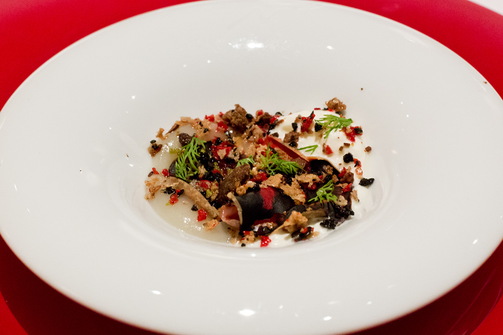 Eine knusprige Textur, ein facettenreicher Geschmack nach Pilzen und Wald und dazu ein Löffel der nach Harz schmeckt. Eigentlich gute Voraussetzungen für einen spannenden Spaziergang durch das Unterholz, doch irgendwie will der Funke bei uns nicht überspringen. Uns stört vor allem die salzig, weisse Sülze. So ist dieses Erlebnis weitaus weniger genussreich als die Version die wir bei Heston Blumenthal vor ein paar Jahren erleben durften.