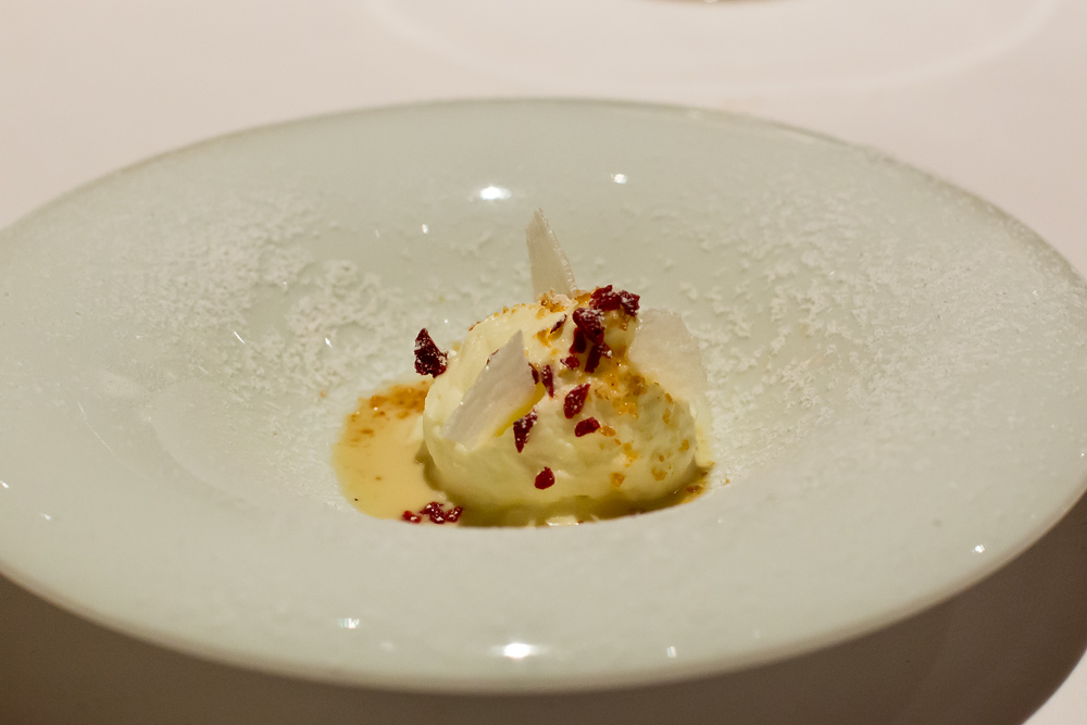 Auch das sehr gutesJoghurt-Eis mit Yuzu-Öl könnte gut als Dessert durchgehen. Ergänzt wird das Gericht, indem wir die Bisquit-Füllung mit gefriergetrocknetem Mais darüber leeren. Das Geschmacksbild ändert sich zwar nicht, jedoch wird das Ganze um eine Textur reicher.