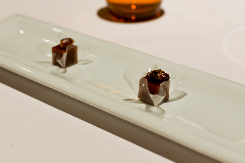 Langsam wird das Menü etwas gar stark in die Länge gezogen. Denn wie schon auf die bisherigen Gänge, warten wir auch jetzt jeweils zehn Minuten auf das nächste Dessert. Da diese aber immer kleiner werden, würde es in unseren Augen mehr Sinn machen, wenn man die Nascherien vereint auf einem Teller servieren würde.