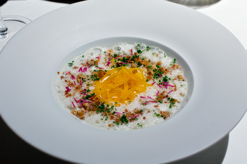 Nun wir uns ein südkoreanisch inspiriertes Gericht serviert. Der Daikonrettich wird in dem asiatichen Land sehr oft in der Küche verwendet. Er hat ein milderes Aroma als der Rettich den wir bei uns kennen, deshalb eignet er sich gut für ein schön balanciertes Gericht wie dieses. Die Basis bildet ein Reismilch-Sud, der mit Shirodashi abgeschmeckt ist. Das Gericht duftet nicht nur stark nach Asien (toll der Koriander), sondern bringt auch alle Vorzüge, die wir an dieser Küche lieben in den Vordergrund. Stark wie Sven wiederum die Säure integriert und mit den unterschiedlichen Konsistenzen arbeitet. Ein absolut harmonisches und geschmacksintensives Erlebnis das uns völlig beeindruckt.