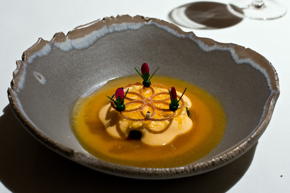 Weiter geht es mit einem Signature Dish von Sven Wassmer. Wir kamen bereits in Vals in den Genuss dieses genialen Gerichts und hofften deshalb insgeheim, dass der Saibling aus dem Val Lumnezia heute nochmals seinen Auftritt hat. Der mit Heu und Tanne geräucherte Fisch ist glasig gegart und duftet himmlisch nach einem Nadelwald kurz nach einem intensiven Sommergewitter. Die Sauce besteht aus Rahm die so stark einreduziert wurde, dass sich das Fett von der Molke trennte. Die Molke wurde dann karamellisiert und wieder mit dem Fett, Milch und Rahm vermengt. Dadurch hat das Gericht auch diese dezente, aber fantastische Süsse. Kurz vor dem Service wird etwas Tannenöl in die Sauce geträufelt. Das Resultat ist grandios. Es schmeckt rauchig, wie an einem Lagerfeuer inmitten eines dichten Waldes. Dieses Bild taucht vor unseren Augen auf, während wir Bissen für Bissen geniessen, ohne auch nur ein Wort zu sprechen.