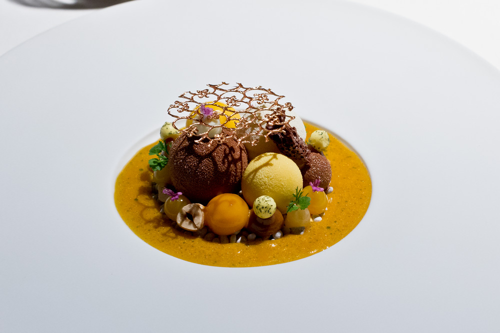 Die Königstaube bringt das Menü sofort wieder aufs ganz hohe Niveau. Die Taubenbrust aus der Bresse schmeckt grossartig und ist perfekt gegart. Das Gericht läuft in Kombination mit dem Knollensellerie, den eingelegten Pilzen und der Nusspaste zur Höchstform auf. Das essbare Laub wird aus Selleriesaft und fermentiertem Steinpilzsaft hergestellt. Ein grossartiger Abschluss der salzigen Gerichte.