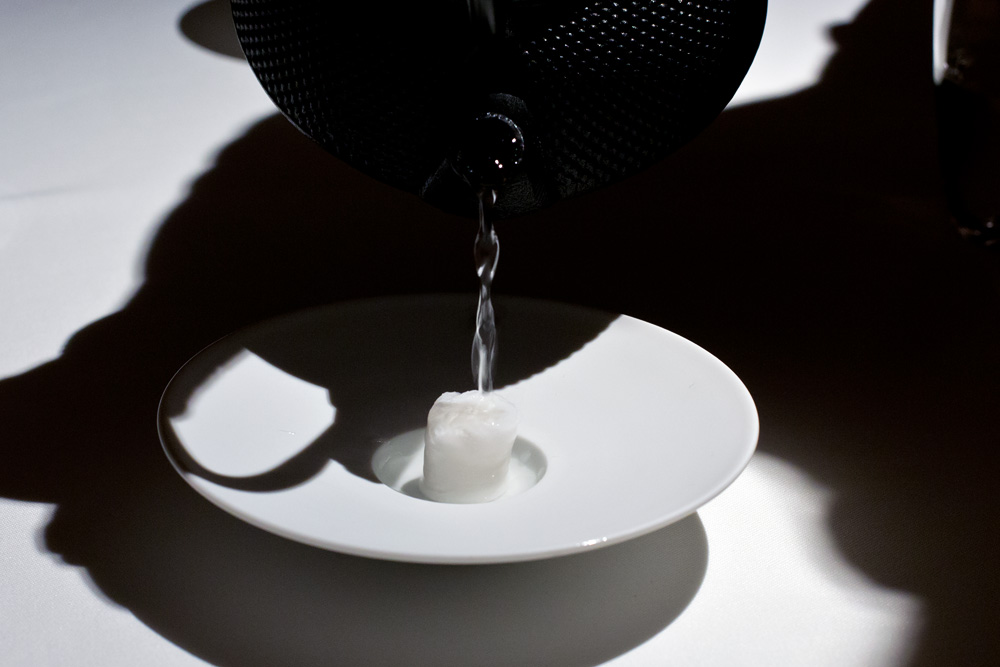 Jetzt wird es innovativ. Es war schon lange Svens Wunsch ein Raclette zu servieren. In einem solchen Menü wäre ein klassisches Raclette zu schwer. Deshalb hat er nach einer anderen Variante geforscht. Zuerst hat er die perfekte Kartoffel gesucht und ist bei der belgischen Sorte „Corne de Gatte“ fündig geworden. Dies wegen der leicht wachsigen Konsistenz und dem nussig-buttrigem Eigenaroma. Beim Käse entschied sich Sven nach langem ausprobieren für einen 18 Monate alten Gruyère und einen 48 Monate alten Sbrinz – den Letzten der noch auf einer Alp in der Innerschweiz hergestellt wird. Die beiden Käsesorten werden im Wasser geschmolzen und danach gemixt damit sich alle Geschmacksstoffe lösen. Danach wird das ganze passiert und à la minute mit Kuzu – einem ursprünglich aus Asien stammenden Bindemittel gebunden. Das Kuzu gibt dem Käsewasser eine extrem sämige und glänzende Konsistenz. Dadurch hat man sozusagen den geschmolzenen Käse, allerdings ohne das ganze Fett. Darüber wird Périgord Trüffel gehobelt. Von uns gibt es grossen Applaus, zum einen wegen dem genialen Geschmack zum anderen für die Kreativität und Passion die Sven mit diesem Gericht demonstriert.