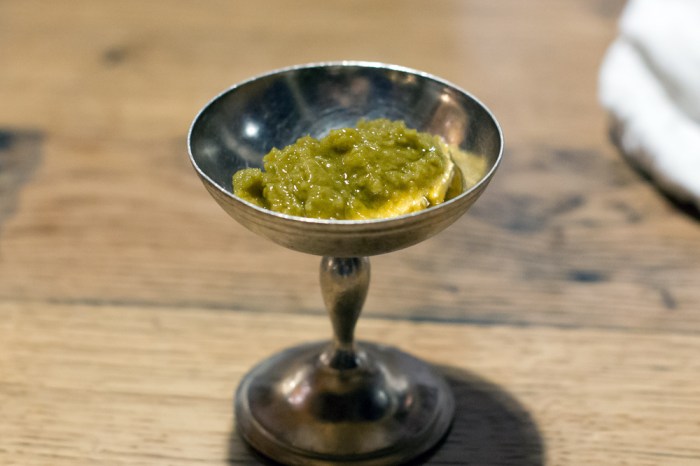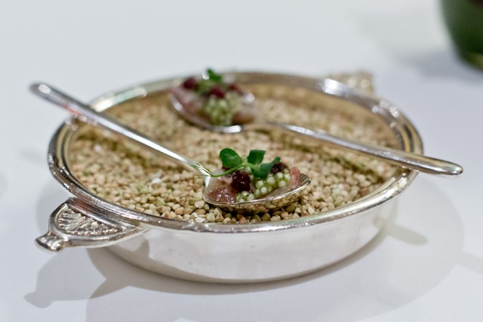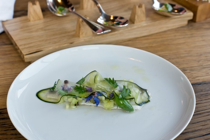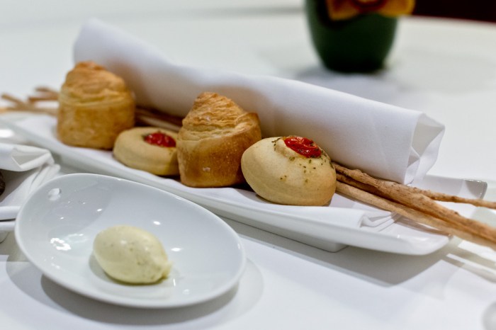Schön, wenn man wie hier das Brot ins Zentrum stellt. Chef de Service Nina Menck präsentiert uns zuerst das hauseigene Sauerteigbrot mit etwas – typisch für die österreichischen Wurzeln des Chefs – Kümmel. Auch die im Innern noch heissen Laugenbrötchen begeistern uns. Dazu serviert man uns etwas Sprossen zum selber schneiden, sowie eine himmlische Butter mit etwas Erdnuss und einer perfekt eingebundenen Sardellen-Note – wow!