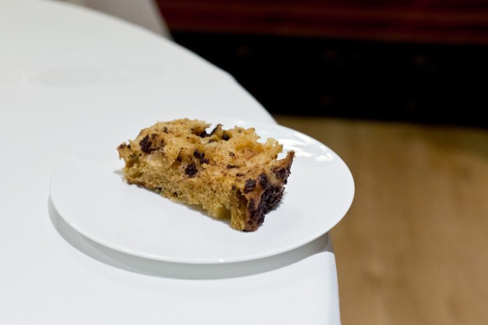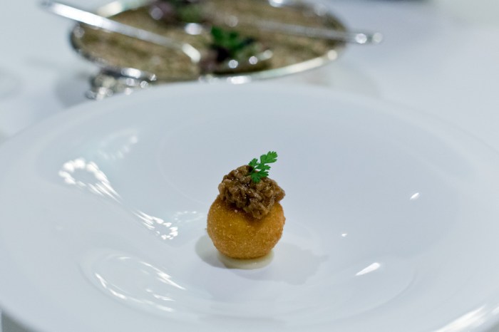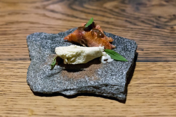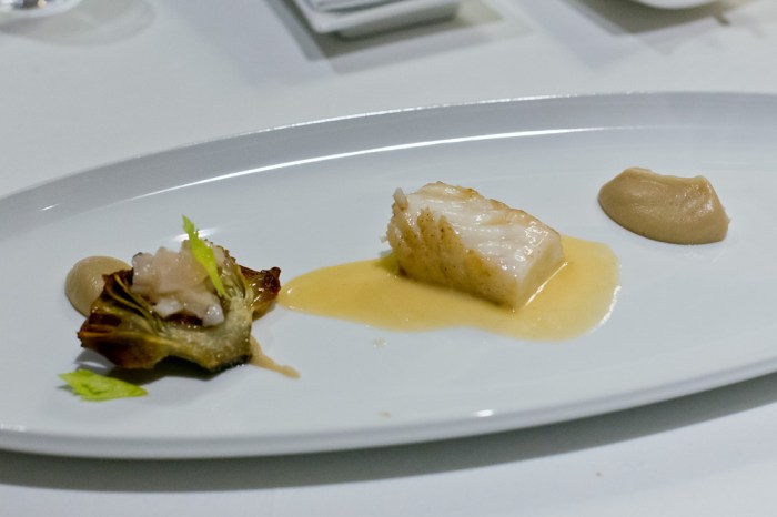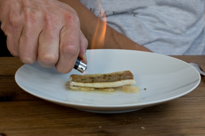Das optisch auffallendste Gericht mit Skrei, Sellerie und Chorizo (7/10) präsentiert Koch Michele D’Arienzo voller Stolz an unserem Tisch. In der Tellermitte erhebt sich ein schwarzes Fischskelett und daneben liegt ein dunkler Tentakel. Selbstverständlich handelt es sich in Wahrheit um ein knuspriges, mit Sepia-Tinte gefärbtes Gebäck sowie beim Tentakel um ein in Form gegossenes Knollenselleri-Mousse. Dass verspielte Optik oftmals zu Lasten des Geschmacks geht, haben wir leider schon zu oft erlebt, weshalb wir zu Beginn etwas skeptisch sind. Zum Glück ist diese völlig unbegründet, denn der Geschmack überzeugt bei jeder Komponente auf dem Teller. Die Kombination vom Fisch, mit der in der Salzkruste gebackenen Knollensellerie, dem Chorizo-Schaum und auch der dezent portionierten Pflaume ist sogar eine richtig eindrückliche Marriage. Das ergibt alles Sinn und schmeckt richtig stark.