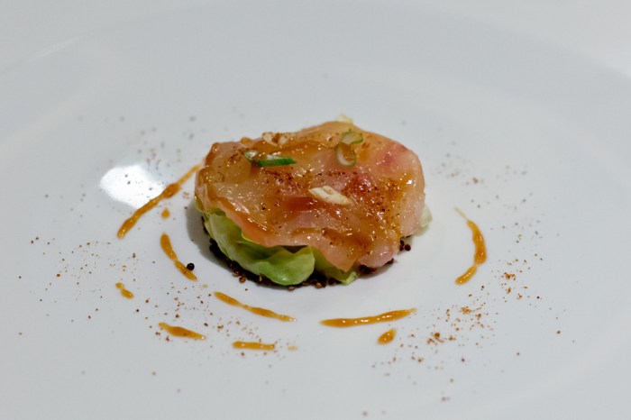 Stand beim letzten Besuch im La Miranda noch eine à la carte-Auswahl zu Verfügung, gibt es seit ein paar Jahren ausschliesslich ein Überraschungsmenü. Dies in 3 – 6 Gängen. Der Service empfiehlt uns, aufgrund der Portionsgrösse, die Variante in vier Gängen (148 Franken) – woran wir uns heute Abend halten.