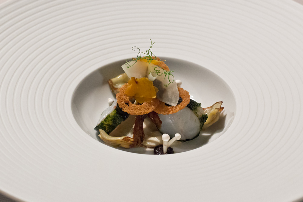 Dann folgt unsere erste Auswahl. Und die entpuppt sich bereits beim ersten Bissen als eine Wucht – wow, was für ein Aroma! Gabel für Gabel steigert sich bei uns das Glücksgefühl. Im Zentrum des Gerichts steht eine wundervolle Lachsforelle, verfeinert mit Kokosschaum mit einer genialen Zitronengrasnote. Das Sauerampferglacé sorgt für einen sehr erfrischen Twist. Das Gericht wird begleitet von himmlisch süsser Ananas in verschiedenen Konsistenzen und (leider) geschmacksneutralen Thai-Spargeln die dem Gericht nur ihre knackige Konsistenz beisteuern. Durch die verschiedenen, harmonischen Akteure, schmeckt jeder Bissen anders. Mal süss, mal frisch, mal lieblich – aber immer hervorragend!
