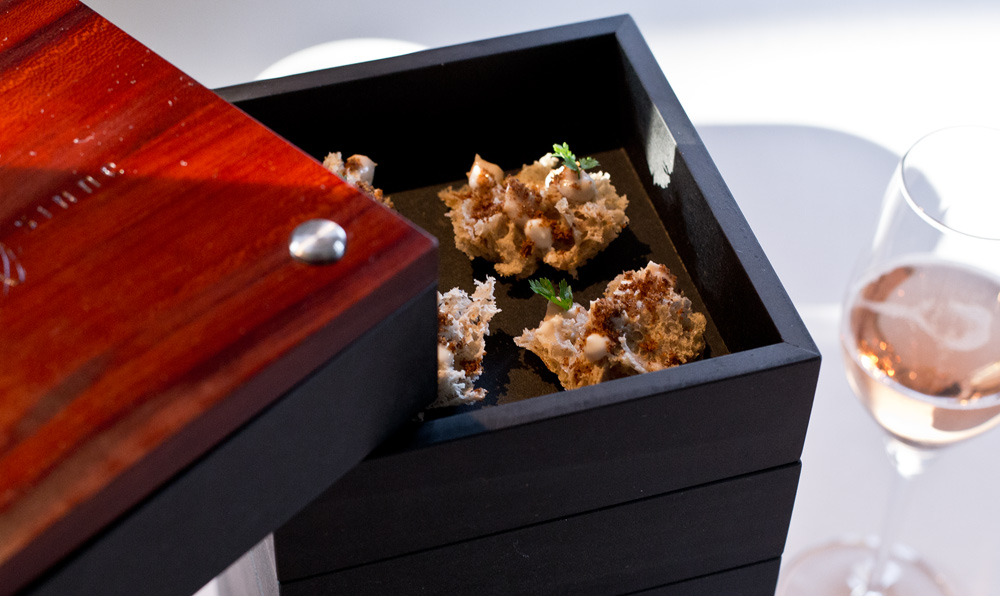 Das Amuse wird uns zeitgleich mit dem Brot serviert, was vom Timing etwas unglücklich ist, weil dieses vor lauter Brot-Toppings beinahe unter geht. Von der Grösse her würde man es sowieso besser zusammen mit den beiden Apérohäppchen servieren und daraus eine Trilogie machen. Mehr Aufmerksamkeit hätte die Petitesse absolut verdient, denn das „Erdnussbutterbrot“ schmeckt richtig gut und ist eine sehr witzige Umsetzung des US-Klassikers. Dort prägt die Kombination aus Brot, Marmelade und Erdnussbutter jede Kindheit. Eine coole und sehr gute Interpretation.