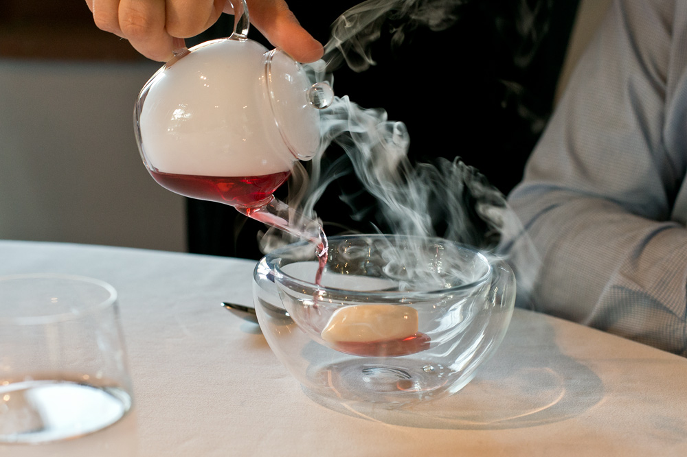 Bei den Suppen haben wir uns nur schweren Herzens gegen die Hummerbisque entschieden und dafür die „Schweinerei“ gewählt. Die Sau stammt von Holzen aus Ennetbürgen die für ihre Qualität gleich bekannt sind wie für die artgerechte Tierhaltung. Ott verwertet das ganze Schwein. So finden wir auf dem Teller verschiedene Stücke. Da ist zum Beispiel der geräucherte Rüssel, das Bäckchen in den frittierten Pralinen und Kinnfleisch. Den grossen Rest des Tieres findet man in der Consommé. Diese wird am Tisch aufgegossen. Dank den allesamt sehr gut zubereiteten Stücke offenbart sich am Gaumen ein intensiver, animalischer Geschmack. Einzig die Consommé dürfte noch etwas wuchtiger sein um damit für noch mehr Intensität zu sorgen.