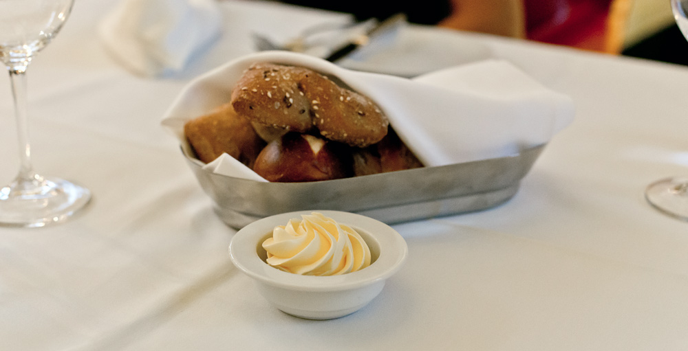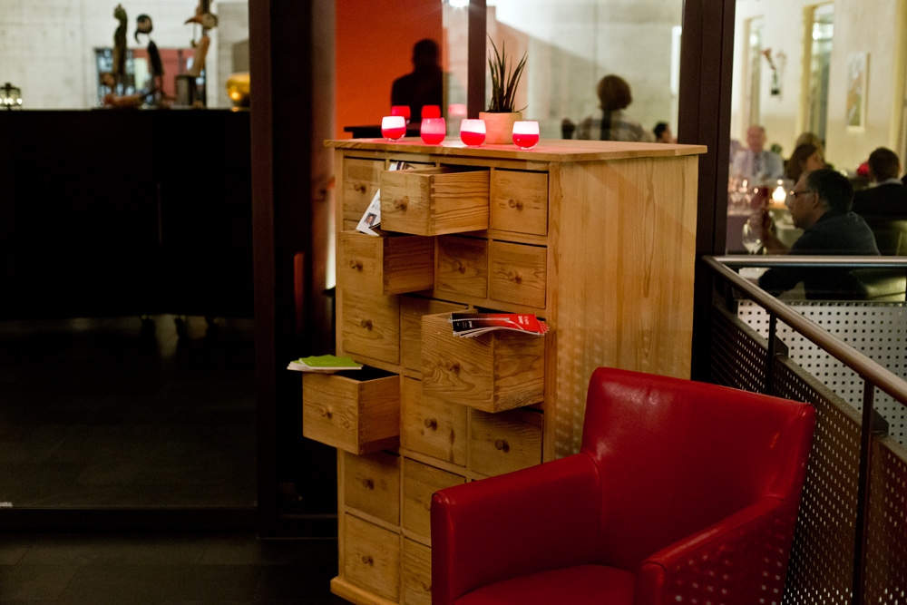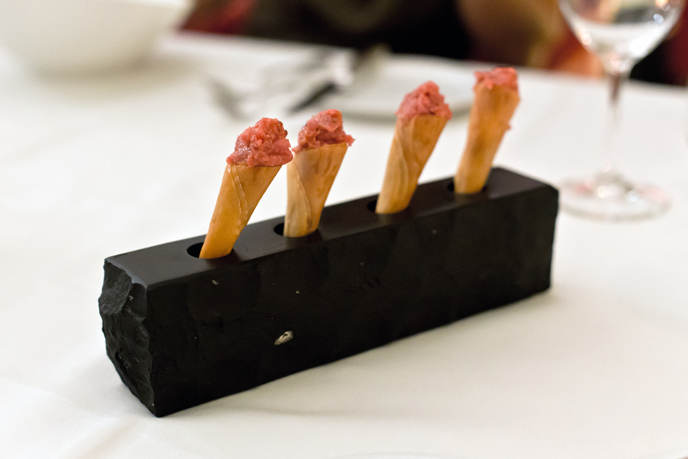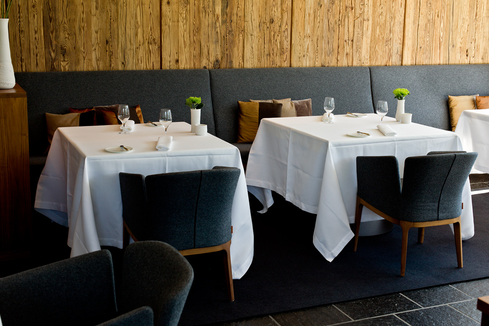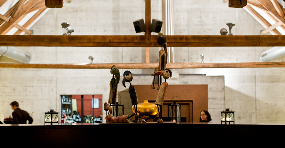 Ein paar Minuten verspätet, haben wir es dann doch geschafft. Wir betreten das von aussen eher bieder wirkende Restaurant und treffen innen auf ein dunkles, rot gestrichenes Kellergewölbe. Die 16 Tische sind auf zwei Speiseräume verteilt. Auf jedem Stuhl wartet ein flauschiges Lammfell, auf den Tischen stehen bunte Setzteller und in jeder Tischmitte eine Muh-Dose – wir sollen gleich erfahren weshalb. Eine grosse, elegant gekleidete Servicebrigade serviert den Gästen um uns herum den Apéro.