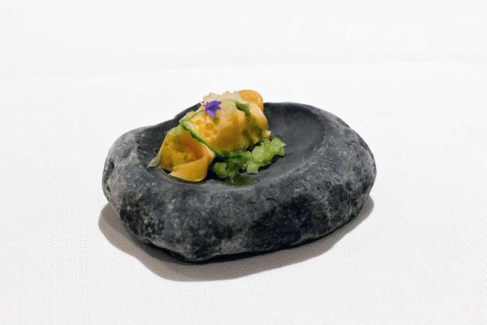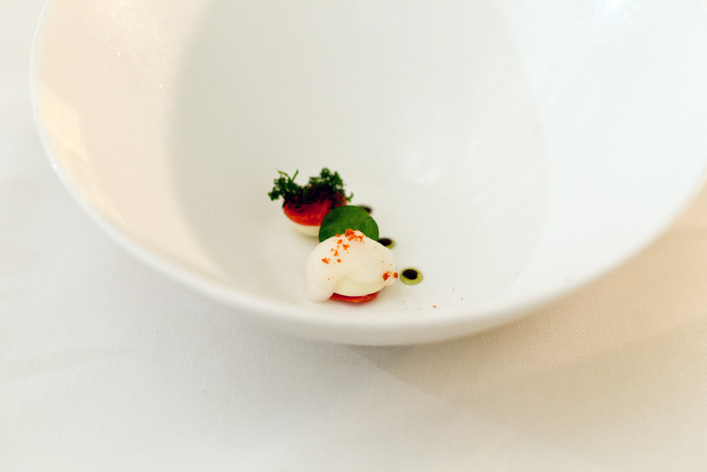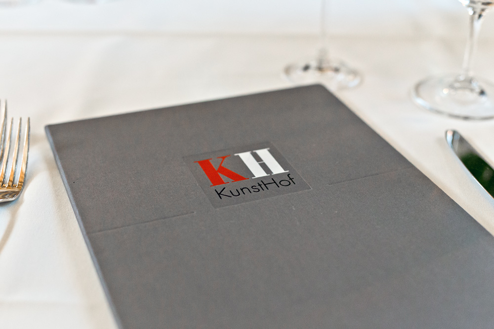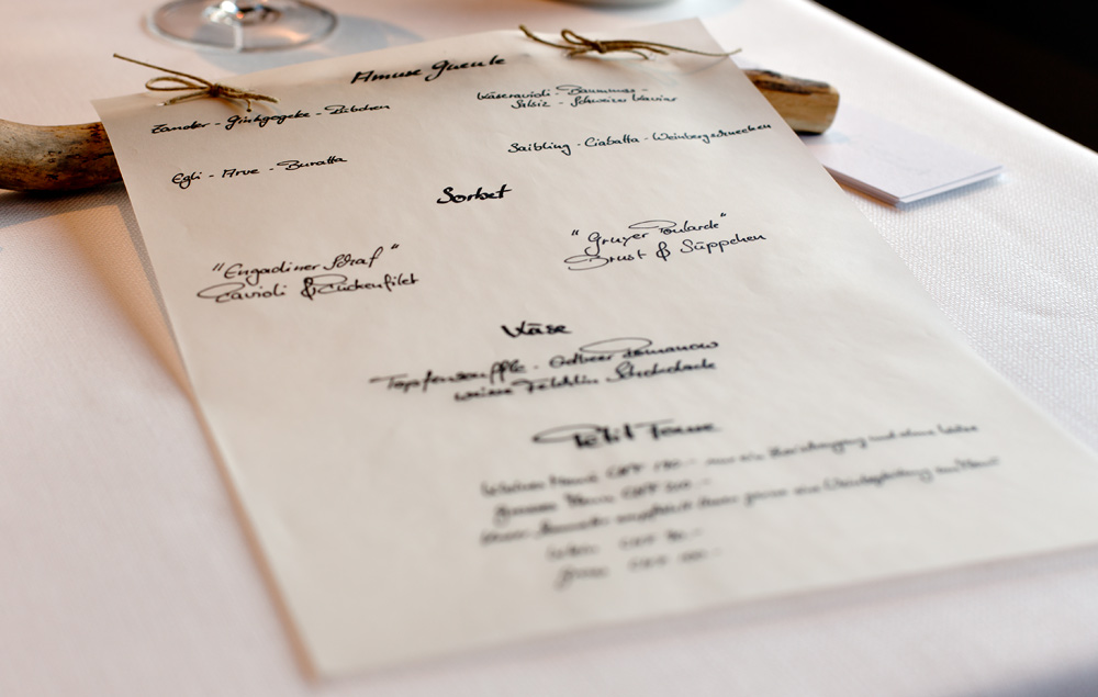 Am Tisch angekommen erhalten wir die Weinkarte. Die Auswahl ist knapp und mehrheitlich auf Flaschen ab einem dreistelligen Betrag limitiert. Eine Speisekarte ist obsolet, denn hier wird ausschliesslich das 26 Gänge umfassende Menü serviert. Auf Allergien und Unverträglichkeiten wird eingegangen. Wir sind bei der Weinauswahl, mit Blick auf das abwechslungsreiche Menü, überfordert und wünschen uns eine passende Weinbegleitung. Eine solche bietet man überraschenderweise nicht an, weshalb wir uns für ein Glas vom einzigen Weisswein im Offenausschank entscheiden.