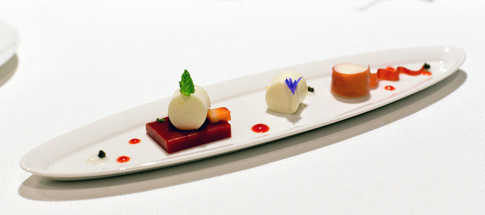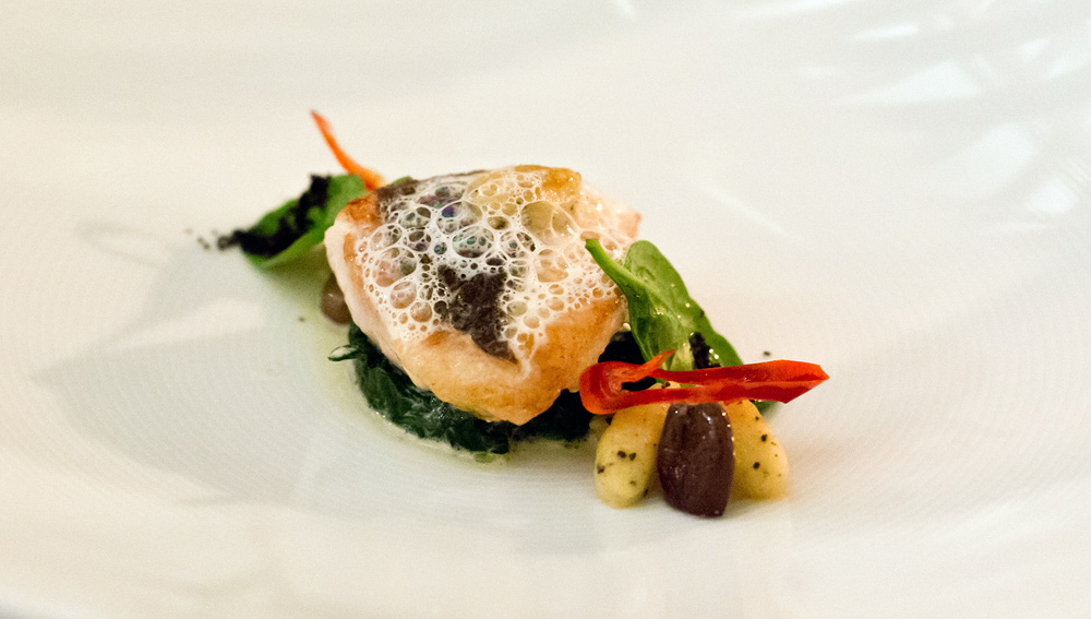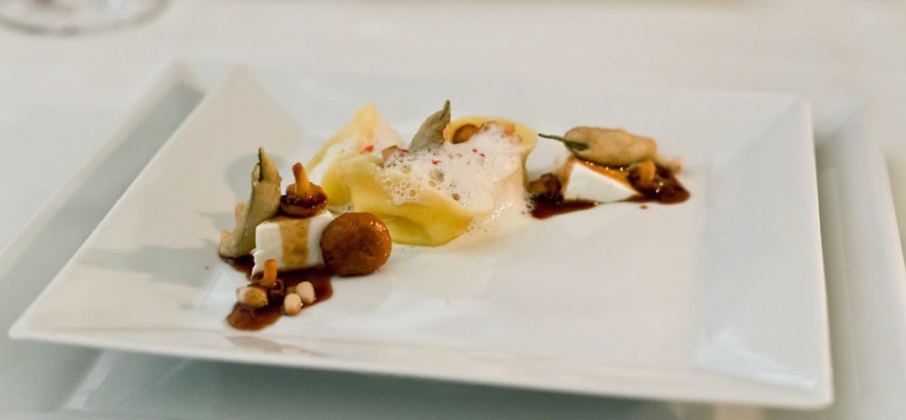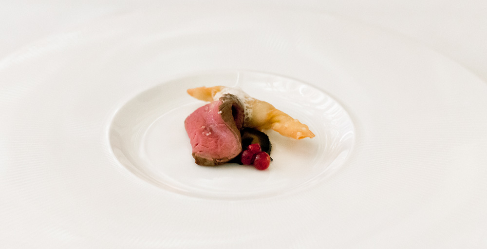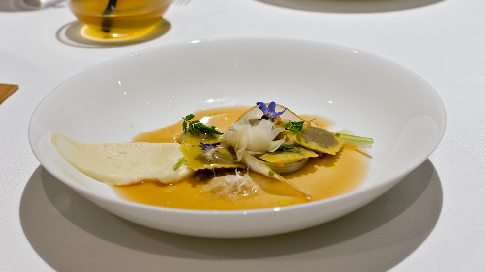 Zeit für einen signature Dish von Martin. Das Gericht steht seit 2008 auf seiner Karte. Wir tauchen den Löffel in die Schale und führen das Müsli an den Gaumen. Dort schmilzen die Leberperlen langsam und setzen ein sehr feines Aroma frei. Sofort wird es von den Säurenoten der getrockneten Himbeere und Passionsfrucht flankiert. Ein sehr gutes und harmonisches Gericht, bei dem wir uns lediglich ein etwas intensiveres Leber-Aroma wünschten. Zudem vermissen wir die vom Gault-Millau erwähnte „Explosion am Gaumen“. Die kleinen Leber-Stückchen schmelzen zu langsam um eine solche Wirkung zu erzeugen. Trotzdem, bis jetzt klar das beste Gericht – so darf es weitergehen!
