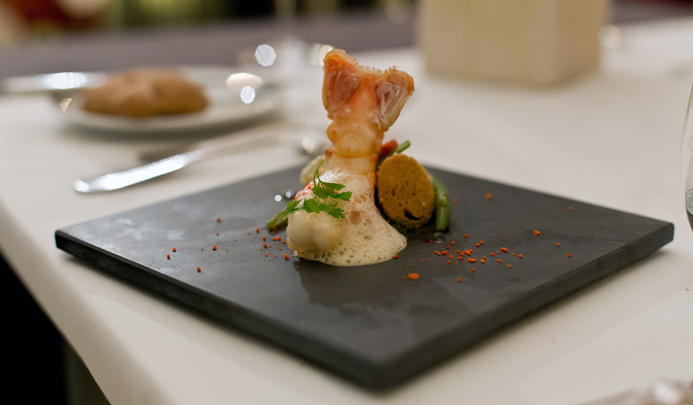 Auffallend, zum ersten Mal am heutigen Abend verbreitet sich im Restaurant ein angenehmer Duft nach gutem Essen. Ein toller Kaisergranat an leicht geröstetem Sesam wird serviert. Eigentlich ein wunderbares Gericht, wäre da nicht dieses befremdliche Rotweinpulver, welches überhaupt nicht zum Krustentier passen will und ihm damit die Chance raubt das Highllight des Abends zu werden.