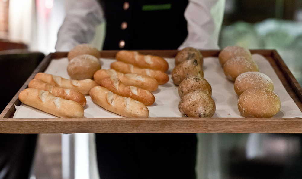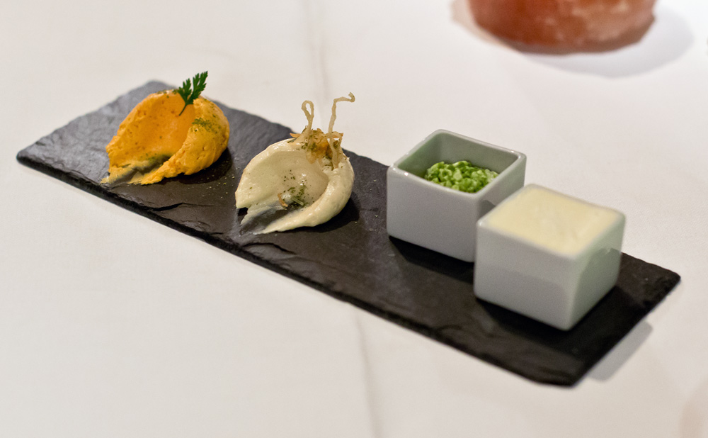 Wir starten den Abend mit einer kleinen Brotselektion. Dazu serviert man uns eine luftige Tomatenbutter, etwas Ziegenkäse mit Peterli, eine herzhafte Zwiebelbutter sowie eine Bauernbutter mit Fleur de Sel. Die Quadrologie schmeckt sehr gut und wir müssen uns, angesichts des bevorstehenden Menüs, stark in Zurückhaltung üben.