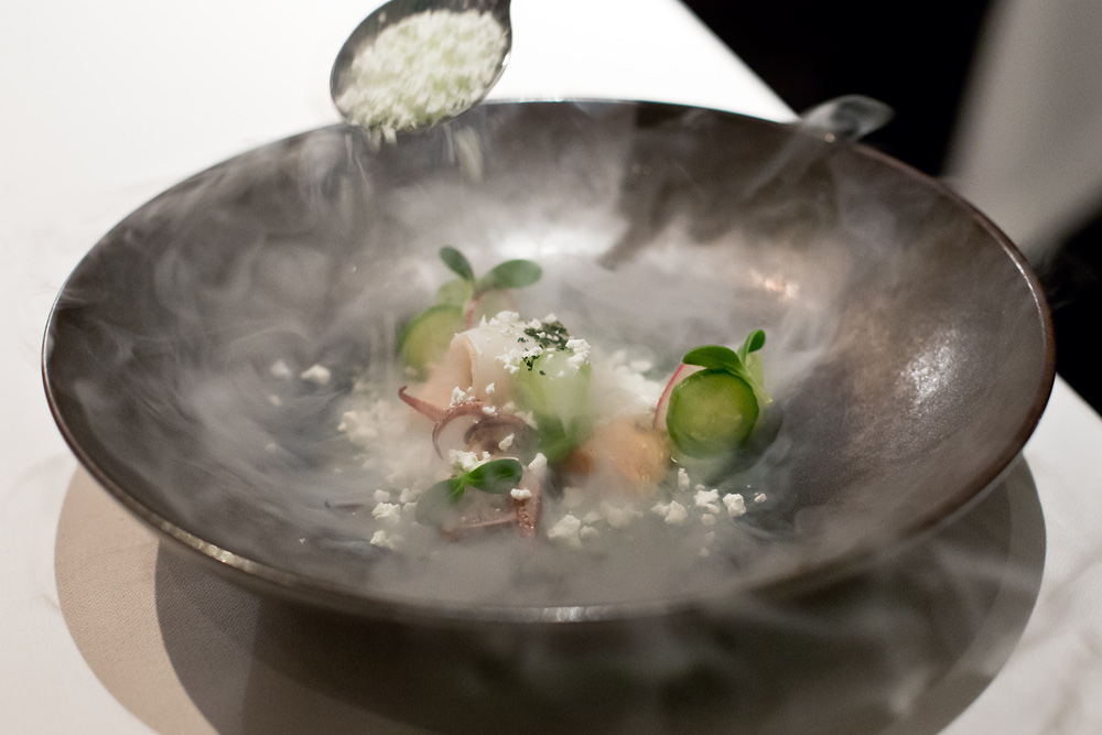 Der emporsteigende Dampf verhüllt den Blick auf das Gericht. Doch in der Nase ist bereits ein erfrischender Duft von Dill, Gurken und Wasabi wahrnehmbar. Letzterer stammt von den Stickstoffperlen die beim Servieren auf dem Teller verteilt wurden und nun langsam zu schmelzen beginnen. Das Gericht bekommt dadurch eine kühle, angenehme Schärfte. Kaum hat sich der Nebel verzogen entdecken wir auch den Fisch, welcher wiederum von auffallend hoher Qualität ist. Auch der Tintenfisch begeistert mit seinem schmackhaften Aroma nach den Weiten des Meeres. Ein ausgezeichnetes Gericht mit richtig viel Power.