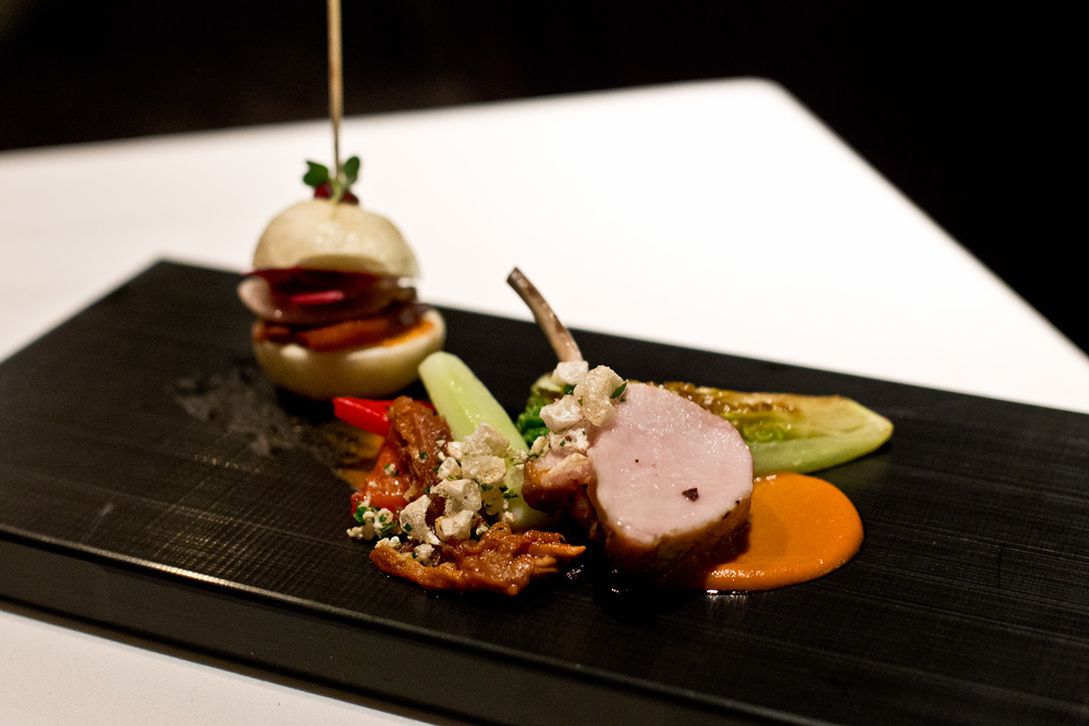 Das letzte Häppchen ist eine vegetarische Komposition, die uns durch und durch begeistert. Die seltenen Rüebli-Sorten wurden zuvor in Kaffee eingelegt, wodurch sie über ein prominentes, aber keinesfalls aufdringliches, Mokka-Aroma verfügen. Der Sud ist eine elegante Mischung aus Mandarinen- und Rüeblisaft und sorgt nicht nur für eine leichte Süsse, sondern bringt auch eine angenehme Säure mit sich. Die fein geschnittenen Minzblätter und das darüber geträufelte Minzöl bereichern das Gericht mit einer erfrischenden Note. Ausgezeichnet!