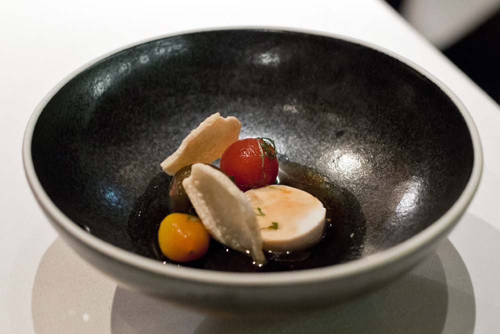Als kleiner Zwischengang serviert man uns drei sonnengereifte Cherrytomaten, die einen Tick zu wenig süss sind, um mit dem Essig-Soja in Einklang zu kommen. Dafür gefallen uns der selbstgemachte Tofu und die Reiscracker aus Sushi-Reis sehr gut.
