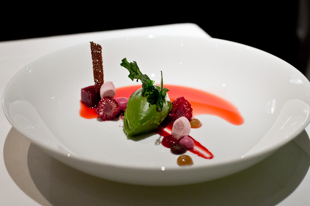 Ein Rucola-Glace ist bestimmt nicht alltäglich, aber schmecken tut es super. Da der Rucola vor der Bearbeitung frittiert wurde, verfügt es nun über einen leicht nussigen Goût. Fruchtig dann die Himbeeren, welche es als Gelées und Marshmallows auf den Teller schaffen. Schön auch der feine Caramel. Witzig das im Mund knisternde Pulver.