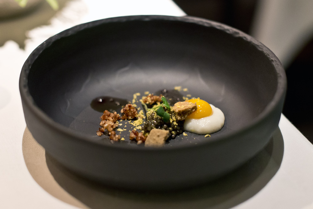 Sich nur auf die grosszügige Nocke Kaviar zu konzentrieren wäre ein veritabler Fehler und würde der Komplexität dieses Gerichts nicht gerecht. Die schwarzen Eier vom sibirischen Stör sind zwar von absoluter top Qualität, aber erst in Kombination mit dem rauchigen Wachtelei, der Buttermilch, den Buchweizen-Crumbles und dem intensiven Kürbiskernöl offenbart sich das ganze Geschmacksbild. Dieses ist facettenreich, setzt aber wiederum ein hohes Mass an Konzentration voraus, um all die Nuancen zu erfassen.